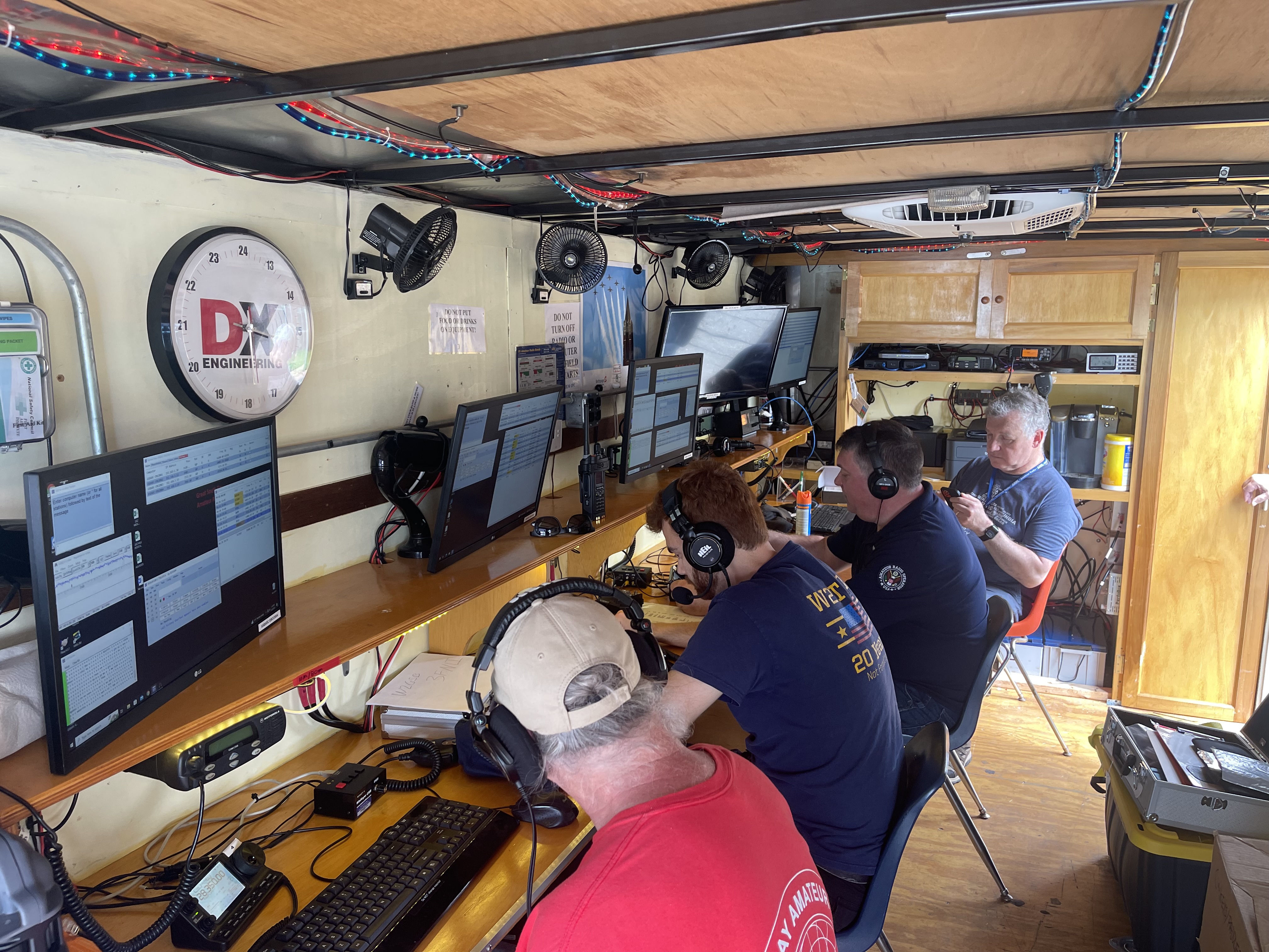 Our club trailer has 3 HF VHF UHF stations all modes SSB CW Digital and Winlink plus FT-8 plus another 2 uhf vhf stations in it all backed up by 400 amps of battery power which is charged via the 200 watt solar panels on the roof and also a 7000 watt generator if needed  for the Air conditioning  and heat.