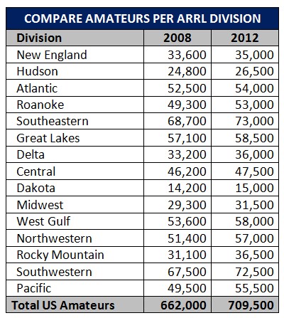 Somma explained that the total number of US amateurs in the FCC database also continues to grow each year: “As of December 31, 2012, the number of licensees reached an all-time high of 709,575; year-end totals were 702,056 for 2011 and 696,041 for 2010. The number of licensees increased at an average rate of 21 per day, while the number of US licensees has increased by 7 percent since 2008!” More than 3000 new licenses were issued in 2012 than in 2011, while upgraded license activity remained steady in 2012.