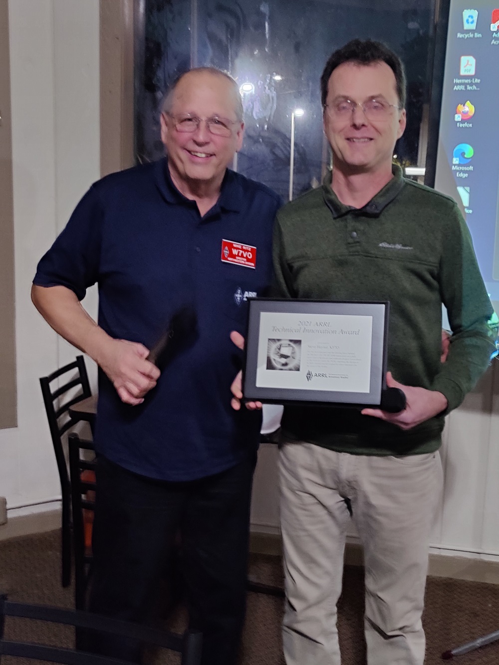 ARRL Northwestern Division Director Mike Ritz, W7VO, presented the 2021 ARRL Technical Innovation Award to Steve Haynal, KF7O, creator of the Hermes-Lite software-defined radio (SDR). "This long-overdue presentation was made during the October 27, 2022, meeting of the Willamette Valley DX Club," said Ritz. The ARRL Board of Directors bestowed the 2021 ARRL Technical Innovation Award to Haynal during its September 2021 meeting. Haynal was cited as the instrumental and driving force behind the Hermes-Lite 5 W HF SDR transceiver being a fully open-source hardware and software project. More information about Hermes-Lite is available on their website.