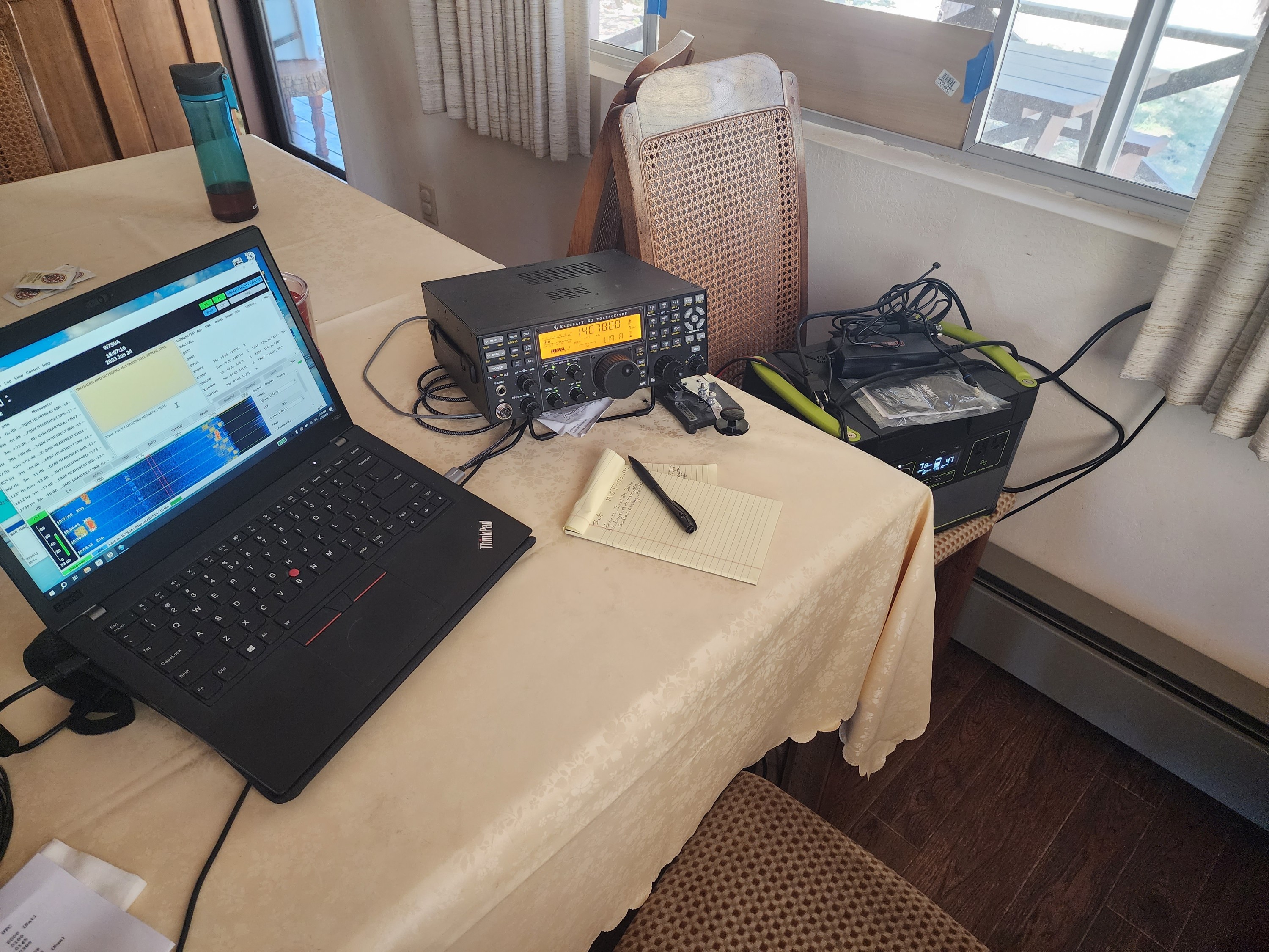 "I set up at our family cabin on the Mogollon Rim [Trail] near Show Low [in Arizona]. [I] used an [Elecraft] K3, [a] Goal Zero Yeti 1500X battery/inverter, [a] 200 -W solar panel for daytime charging, and an [MFJ] G5RV Junior [antenna] strung up in pine [trees] with pre-existing ropes and pulleys. [I] split my time between JS8 and FT8 on 40, 20, and 15 meters. [It was a] nice Field Day, [and] fun!"