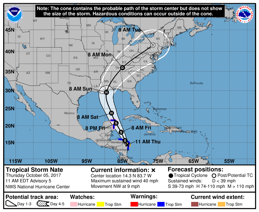 [UPDATED 2017-10-05 @ 1742 UTC] Tropical Storm Nate is now threatening to dump “flooding rains” over portions of Central America, according to the National Hurricane Center (NHC). The storm’s center is now moving across northeastern Nicaragua. The storm has caused heavy rain and flooding in Central America.