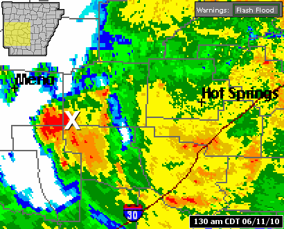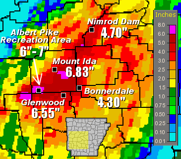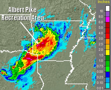 The National Weather Service issued a flood warning about 2 AM -- just after the heaviest rains had started. As the heaviest rains began hitting, a gauge at Langley showed the Little Missouri River was less than 4 feet deep. The river climbed to 20 feet within four hours. State officials said that the terrain and lack of cell phone service in the valleys made communication difficult. Arkansas Governor Mike Beebe said damage at the campground was comparable to that caused by a strong tornado; the force of the water carried one body 8 miles downstream.
