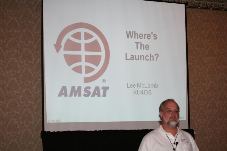 Bob described changes in Department of Defense (DoD) policies that will require DoD-subsidized launches to allow secondary payloads to fill in excess launch capacity of the primary mission. During his talk, "Where's the Launch," Lee McLamb, KU4OS, explained that factors such as the increased size and efficiency of launch vehicles results in excess lift capacity. Gone are the days where adding a pound to the payload meant removing a pound of fuel from the booster. Lee described how current missions on the schedule have 1000 to 1500 pounds of excess capability. These are slots AMSAT can fit into.