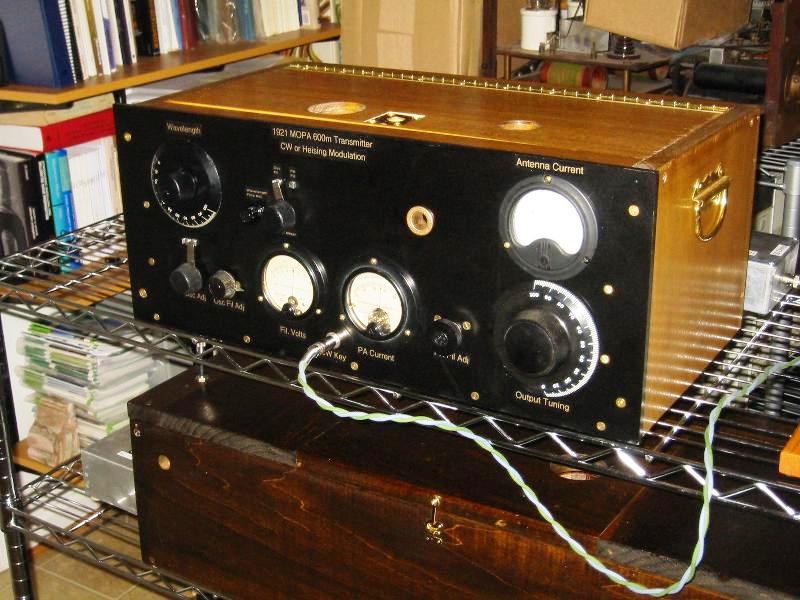 Fessenden’s transmitter was an ac alternator, modulated by placing carbon microphones in series with the antenna feed line. Justin’s homebuilt station is slightly more modern, based on a 1921 vacuum tube master oscillator power amplifier (MOPA) design. The transmitter also uses Heising AM modulation, developed by Raymond Heising during World War I.