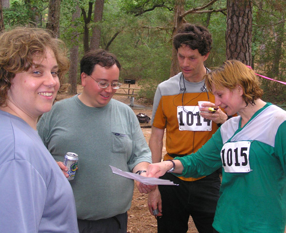 Radio-orienteers -- from nine states plus Canada -- gathered at Copperas Creek campground in Bastrop Park on May 8 for equipment checking and practice. Test transmitters were nearby on both 2 meters and 80 meters. The campground was filled with foxhunters carrying Yagis and other directional antennas, causing some campers to ask, "Are you trying to get TV?"