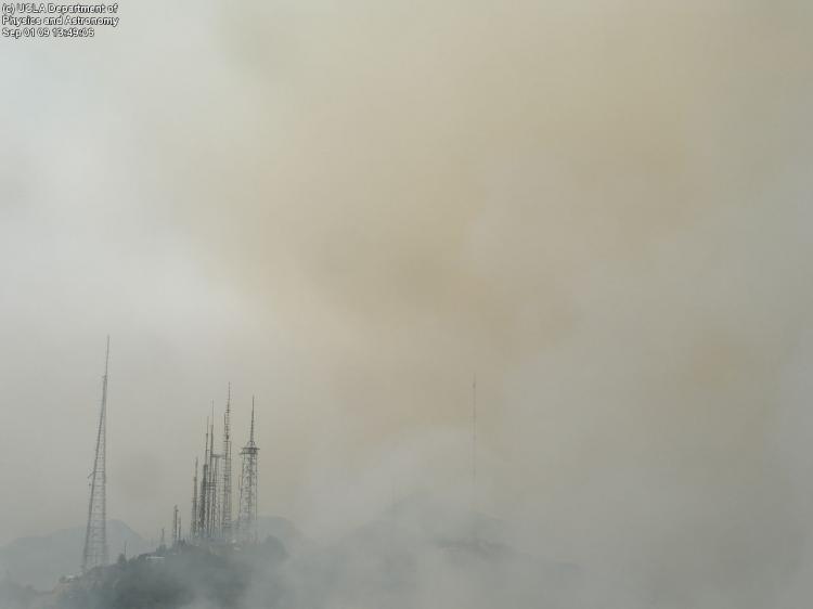 ![This image, take from the 150 foot solar telescope atop Mt Wilson, overlooks Mt Alta where the the television and radio antennas that serve the Los Angeles metropolitan area are located. The image -- taken on September 1 at 1:49:06 PM (PDT) -- was the last image posted by the camera before the T1 lines to the observatory were lost due to the fire. [Photo courtesy of the Division of Astronomy and Astrophysics at UCLA]](/img/130x97/exact/News/nms_1140.jpg)