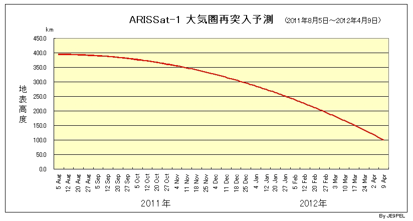 According to predictions from Mineo Wakita, JE9PEL, the ARISSat-1 satellite is due to re-enter Earth’s atmosphere in early April 2012. For complete details, see Mineo’s website.