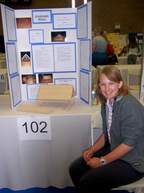 Teri Nittler, KI6QLQ, began with an interest in Architecture and a project idea concerning the effect of hurricane winds on house roofs. She built a model house, put it in a wind tunnel and then measured the force on the roof with different wind speeds. She then tried different ideas to reduce the force of the wind on the roof and used those results to determine her conclusion. Even though she didn't receive an official place, the Association of Professional Engineers thought sufficiently highly of her work to give her a special award.