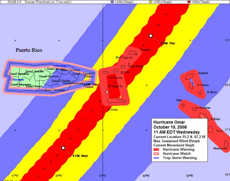 In a report issued by the NWS at 2 PM EDT, Omar is moving toward the east-northeast at near 13 MPH. A gradual turn back toward the northeast is forecast to occur later today, with an increase in forward speed expected over the next day or two. On this track, Omar is forecast to move through the Northern Leeward Islands late tonight and early Thursday.