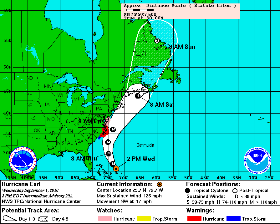 The NHC is predicting that Earl will approach within 60 miles of Cape Hatteras, North Carolina, early on the morning of Friday, September 3, with hurricane-force winds possible along the Outer Banks of North Carolina beginning early on Friday morning and lasting until at least midday. Earl may not make a direct hit on the coast, instead brushing by. As it heads northward, Earl is forecast to pass within 60 miles of Nantucket, Massachusetts as a strong Category 1 or Category 2 hurricane overnight on Friday, but sustained hurricane-force winds should not affect coastal Massachusetts, as the majority of winds will be tropical-storm force beginning Friday afternoon and lasting until midday Saturday, September 4.