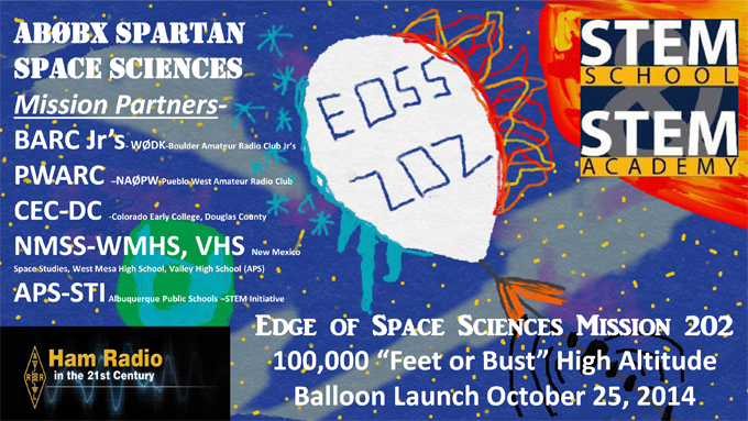 Students from Colorado and New Mexico plan to launch a balloon carrying three ham radio payloads into near-space on October 25 from Deer Trail, Colorado. The Douglas County, Colorado, STEM School and STEM Academy and Spartan Amateur Radio Club, AB0BX, are sponsoring and coordinating the next Edge of Space Sciences (EOSS) balloon flight — EOSS-202. The “AB0BX Spartan Space Sciences” mission involves students from several schools and school Amateur Radio clubs. If successful, EOSS-202 will carry seven student-designed payloads to an altitude of 100,000 feet. The plan calls for recovering the parachute-equipped balloon once it descends back to Earth. Onboard ham radio payloads will help to track the balloon during flight and recovery and also transmit telemetry during the mission.