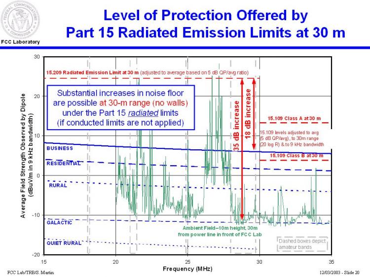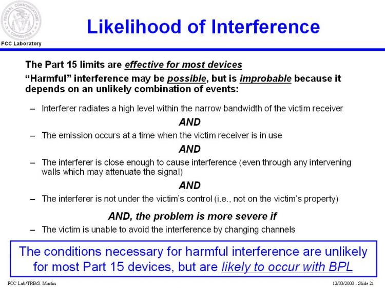 According to Hare's preliminary review of the FNPRM, the FCC's own technical findings clearly spell out that BPL operating at the FCC limits has a very strong potential to cause interference to licensed radio users: "These reports show that BPL causes interference to a number of licensed services for significant distances from BPL noise sources and that the noise from BPL at antennas that are about 100 feet from wires carrying BPL operating at the FCC limits will represent an increase in noise of about 30 dB in most cases."