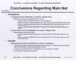 In one study concerning Main.net's BPL system, the FCC found that the system exceeded Part 15 limits, but referenced a comment provided by a BPL provider's Chief Technical Officer: "[i]f distance scaling were based on distance to the pole ground wire rather than the nearest part of the BPL system, measurements would have passed with 1 dB margin at the selected quasi-peak measurement location." The FCCÂ redacted a statement made by its own FCC staff that labeled the CTO's comment as "invalid," yet retained the comment.