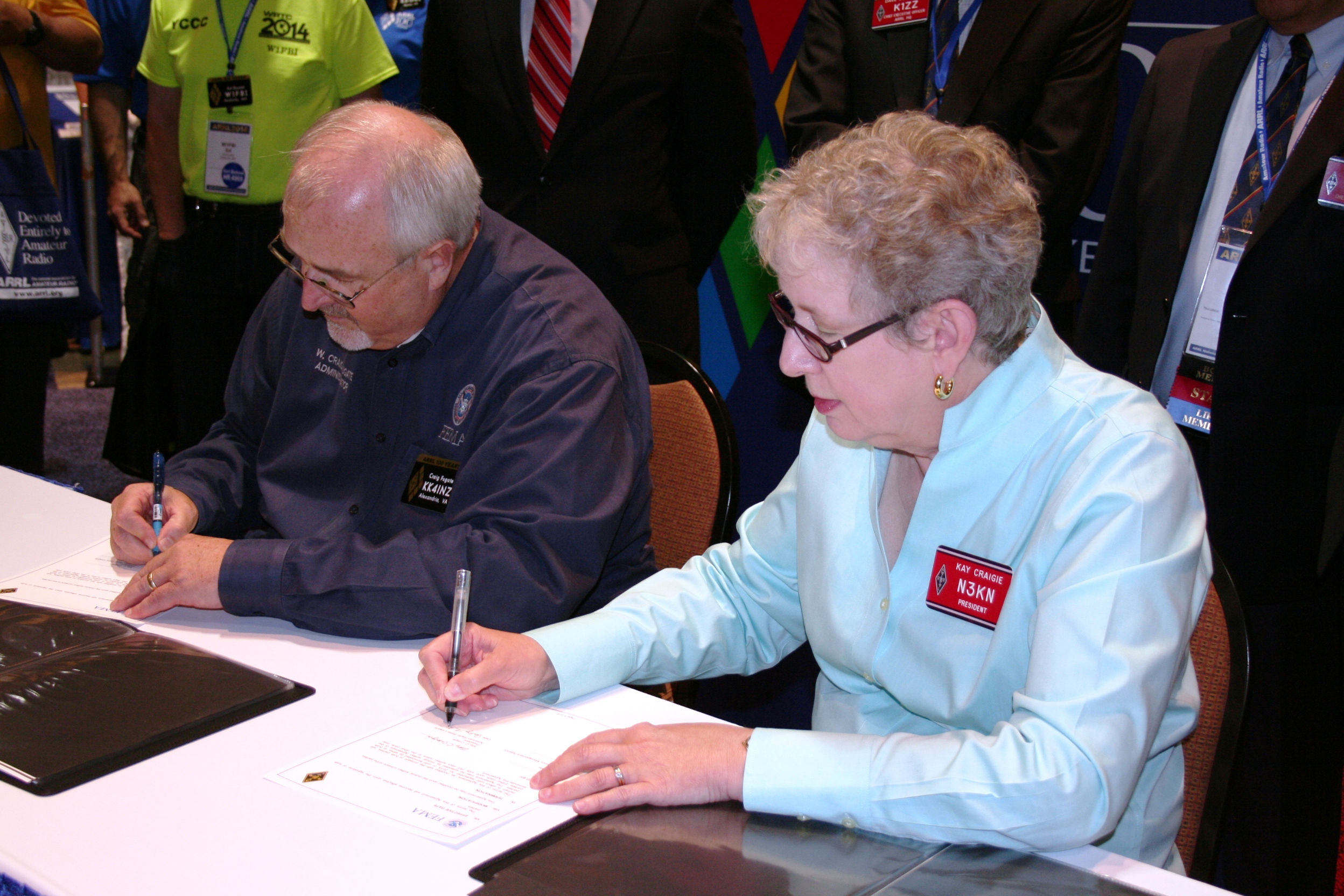 The ARRL and the Federal Emergency Management Agency (FEMA) have announced a Memorandum of Agreement (MOA) that will enhance cooperation between the League and FEMA in the area of disaster communication. FEMA Administrator Craig Fugate, KK4INZ, and ARRL President Kay Craigie, N3KN, signed the agreement July 18 during the ARRL National Centennial Convention at the Connecticut Convention Center in Hartford, Connecticut.