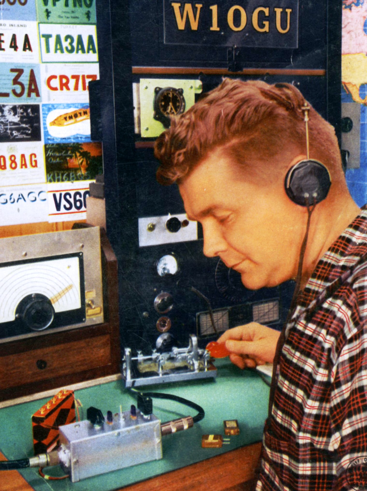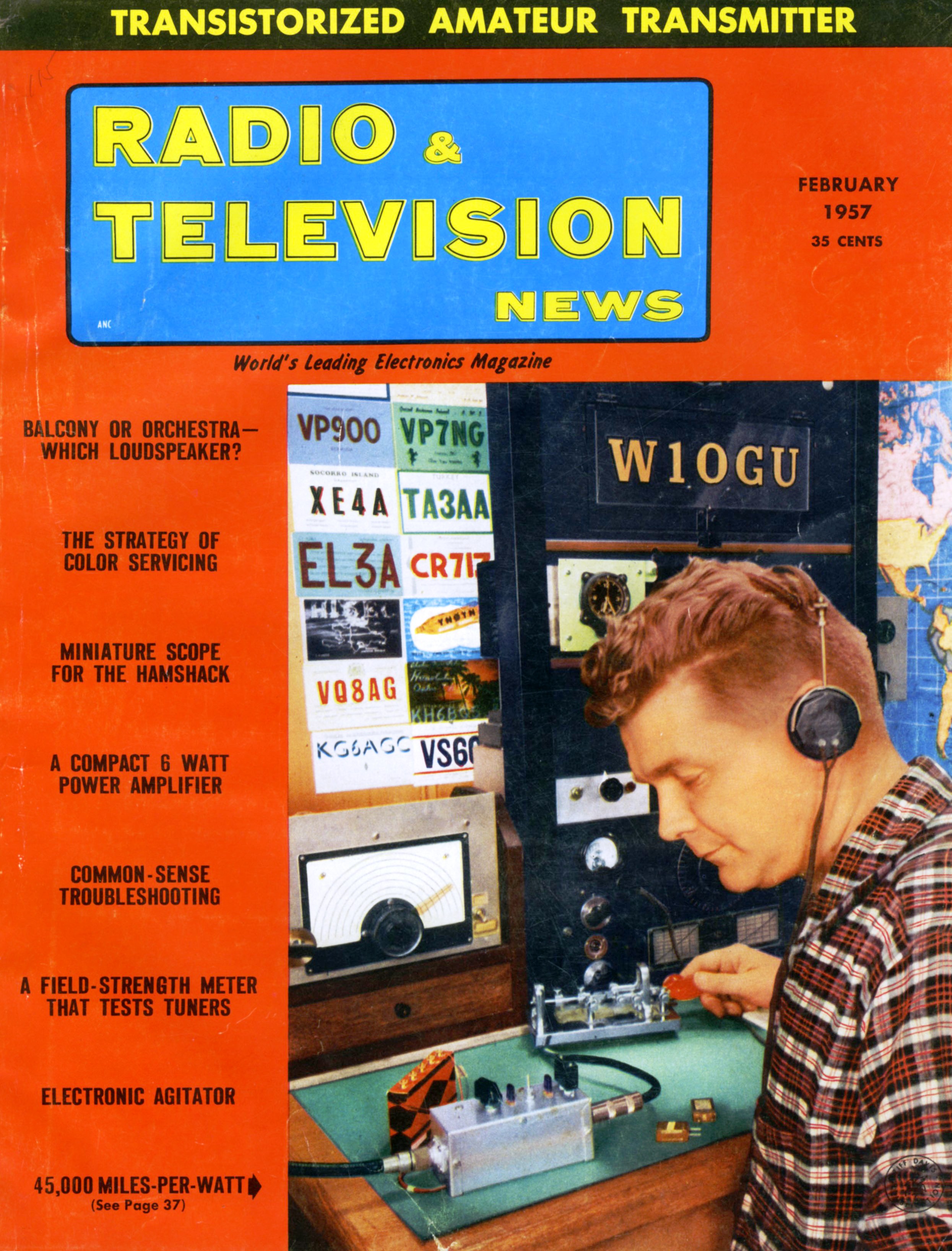 The transmitter was the first to run Raytheon transistors on 20 meters. Hams had previously constructed low-power, solid-state transmitters for 40 meters and made contacts spanning up to 800 miles. Fallgren’s 3800-mile contact worked out to approximately 47,500 miles per watt. Raytheon documented the historic contact in the February 1957 edition of Radio and Television News — with a feature banner and cover photo of W1OGU in his shack with the battery-powered transistor transmitter — and it was reported in other publications as well, including Raytheon’s own publication and the Boston Globe. A November 1956 QST “Stray” reported that Fallgren had “worked KP4, TI2, OZ7, and G3, and has reportedly been heard in VK” with the little rig and included a photo.