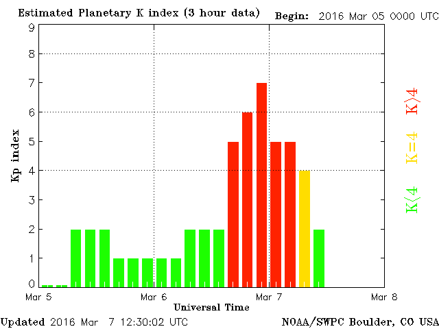 NOAA’s Space Weather Prediction Center (SWPC) reported strong (G3) geomagnetic storming at 2359 UTC on March 6 in response to above-average coronal hole high-speed stream effects.