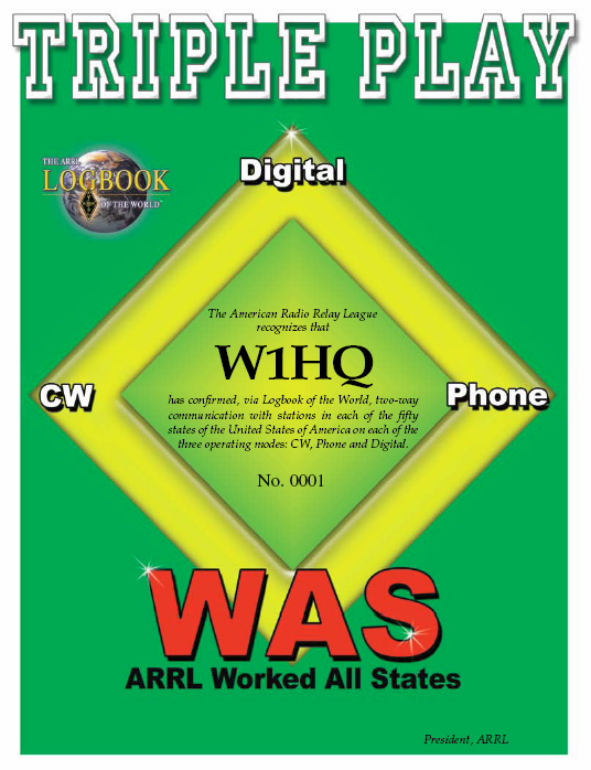 As of January 1, 2009, the ARRL will offer another award: The Triple Play Worked All States Award. This new, exciting award is available to all amateurs who confirm contacts with each of the 50 states using three modes for each state: CW, phone and RTTY/digital. All 150 contacts must be made on or after the starting date and must be confirmed via Logbook of the World (LoTW). All bands -- with the exception of 60 meters -- may be used in pursuit of the Triple Play Award.