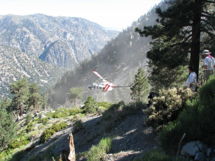 Using his landline, Lippucci called 911 and was transferred three times until he was connected to Chelsea in the San Bernardino County Sheriff's dispatch center. "Chelsea coordinated the rescue with the San Bernardino Fire Department who sent a foot patrol to the area," he said. "The Sherriff's office dispatched a helicopter to meet someone at the ski hut to take them to where the hiker was down. It took a little less than an hour for emergency services to get above the location in a helicopter, but they were not able to land the helicopter due to the rocky terrain at the ski lift." Lippucci said that while the foot patrol and helicopter were on their way, the group of hikers had brought the injured lady down the trail to the ski hut, stabilized her leg and determined it was probably not broken. They still did not feel they could carry her out as the trail down from the wilderness ski lift was so steep." The ski hut can only be reached via a steep three mile hike and 2200 feet elevation gain.