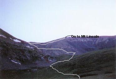 As we progressed, not only did the trail up Mount Cameron get steeper but there was a considerable drop off to the left into the valley below. If you stopped and listened, you could hear the water running in the valley. It was very relaxing to listen to. Then finally we emerged on top of Mount Cameron and had our first view of Mount Lincoln just off to the northeast. Mount Cameron has a very broad and rounded summit, with a steep slope of about 100 feet or so down to the saddle between it and another hill on the way to the Mount Lincoln summit. Within another half hour we stood together with a few others on the summit of Mount Lincoln at about 9:30 AM.