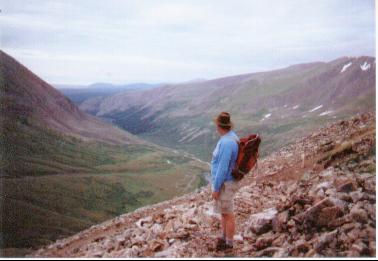 Soon after this we came to the rocky area of the climb and had a great view back down the trail where we could see the parking area and Kite Lake, yes, shaped like a kite with the kite’s tail formed from the stream feeding down the hill. We continued up the steep trail to the saddle area between the left branch of the trail up Mount Democrat, to the right branch up Mount Cameron. The view into the valley north of the Democrat/Cameron/Lincoln complex was beautiful.