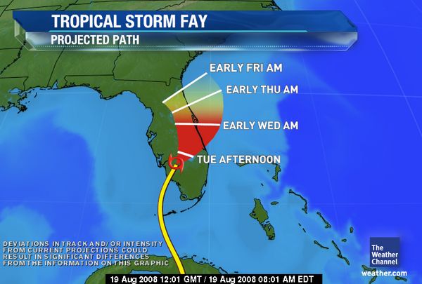 While Tropical Storm Fay made landfall over Key West, Florida at 3 PM EDT on August 18, Amateur Radio operators throughout Florida were prepared "just in case." As Fay crossed Key West, Florida Emergency Management officials noted that while "Fay is no Hurricane Charley," it is following the same general path as 2004's Charley, a Category 4 hurricane and one of the most destructive hurricanes in recent history for the area; at least 13 people were killed in that storm. A tropical storm warning is still in effect for the Florida Keys and the majority of Florida's Atlantic coast. All hurricane warnings have been discontinued.