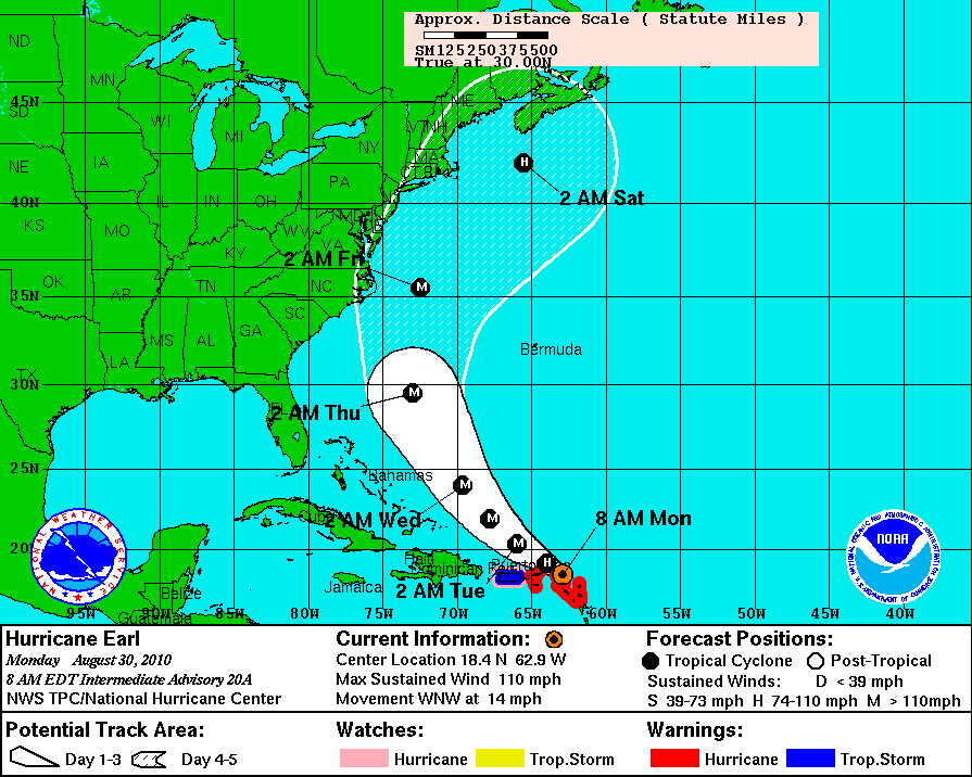 With Hurricane Earl now a category 2 storm -- and expected to become a major hurricane -- WX4NHC and the Hurricane Watch Net (HWN) -- activated at 8 AM EDT on Monday, August 30; WX4NHC is the Amateur Radio station at the National Hurricane Center (NHC) in Miami, Florida. As of 8 AM (EDT) on Monday, August 30, Earl’s center is approximately 25 miles east north-northeast of St Martin in the northern Leeward Islands and is expected to steadily strengthen over the next few days. Earl was moving to the west-northwest near 14 miles per hour, with hurricane force winds of up to 50 miles extending outward from Earl’s center, with tropical storm force winds extending outward up to 175 miles.