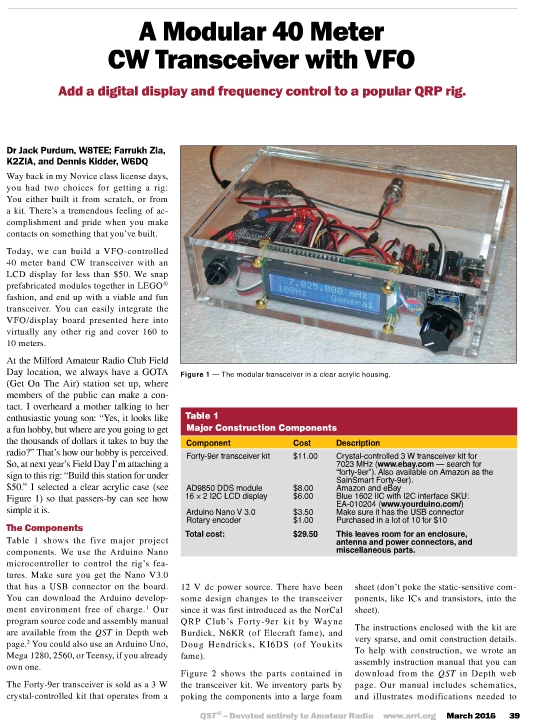The winner of the March 2016 QST Cover Plaque award is “A Modular 40 Meter CW Transceiver with VFO” by Dr Jack Purdum, W8TEE, Farrukh Zia, K2ZIA and Dennis Kidder, W6DQ.