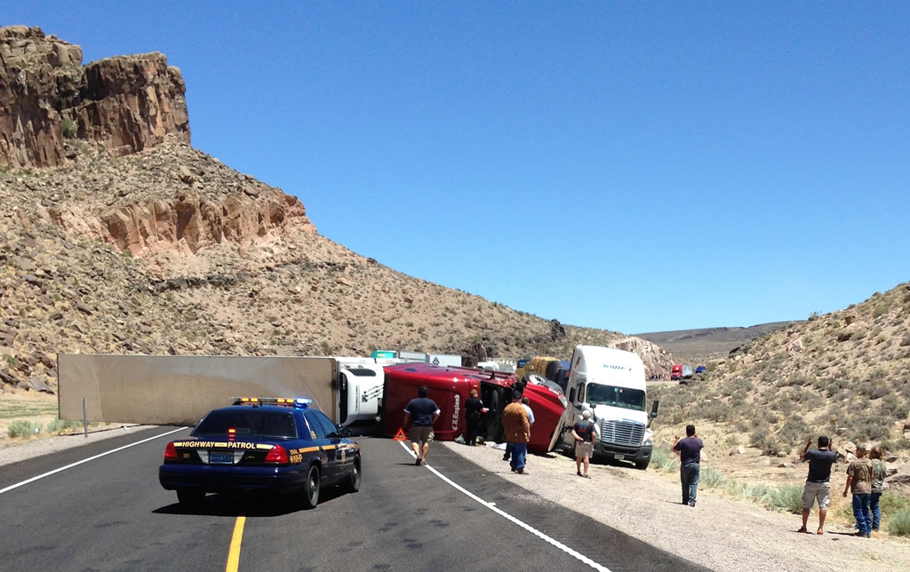 Porter placed the net in emergency status, pinned down further details on the wreck, and notified the Las Vegas Police Department to relay the necessary information. A short time later, Nevada Highway Patrol troopers were dispatched to the scene. There were no injuries, but the highway was completely blocked in both directions, and some of the tractor-trailer’s perishable cargo ended up scattered on the roadway.