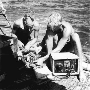 For 3 weeks following the crew’s departure from Peru, the only radio contact Kon-Tiki had was with OBE, the station of the Peruvian Naval School. LI2B kept to a schedule, trying to contact key amateur stations on specified frequencies without success. Finally, on May 20, Harold Kempel, W6EVM, heard and worked LI2B on 14.142 MHz, providing the raft with its first North American contact. By mid-June, LI2B had worked numerous amateur stations, and as the trip progressed, a long-haul network of amateur stations developed. One of the network regulars was W3YA, the Penn State Amateur Radio Club station, which helped relay traffic to the Norwegian embassy in Washington. In the final month of the voyage, the 20 meter transmitter’s crystals all had failed, so the crew re-tuned the 10 meter transmitter to 13.990 MHz, the closest they could get to 20 meters.