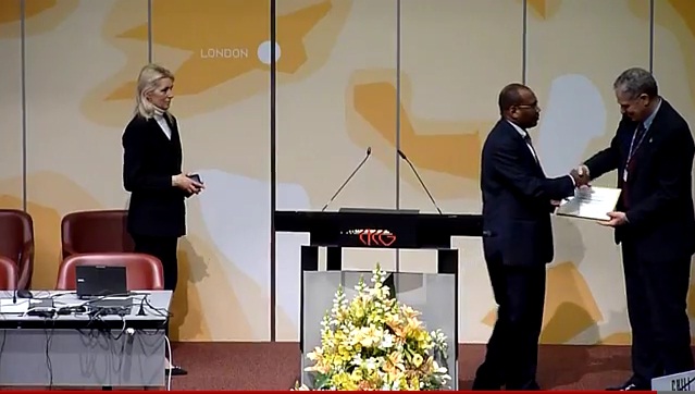 ![International Telecommunication Union Secretary General Dr Hamadoun Touré, HB9EHT, presents 1993 Nobel Laureate Joe Taylor, K1JT, with the ITU Gold Medal in recognition of Dr Taylor’s outstanding contribution to the research in the field of radiocommunication at the 2012 World Radiocommunication Conference (WRC-12). [Screengrab courtesy of video provided by Andy Clegg, W4JE]](/img/130x97/exact/News/ToureTaylorGoldMedal.jpg)