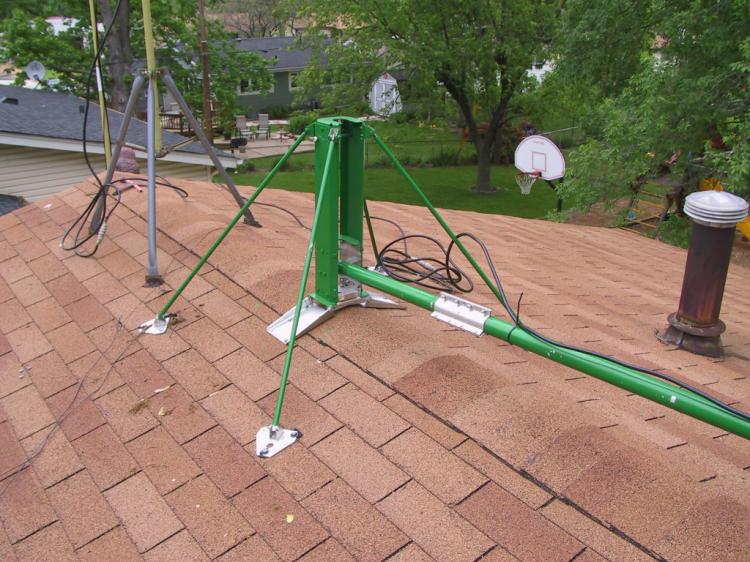 The mast on which I wanted to mount my antenna coupler was a Penninger Tipper. As you might have guessed from the name, it tips over. I slipped an old TV dinner tray under the mast to prevent it from tipping all the way down to the roof. There was, after all, a VHF/UHF antenna already mounted at the top of the mast. If I lowered it all the way, the antenna would get squashed. I know that would make for a great future column, but it would've made me very unhappy.