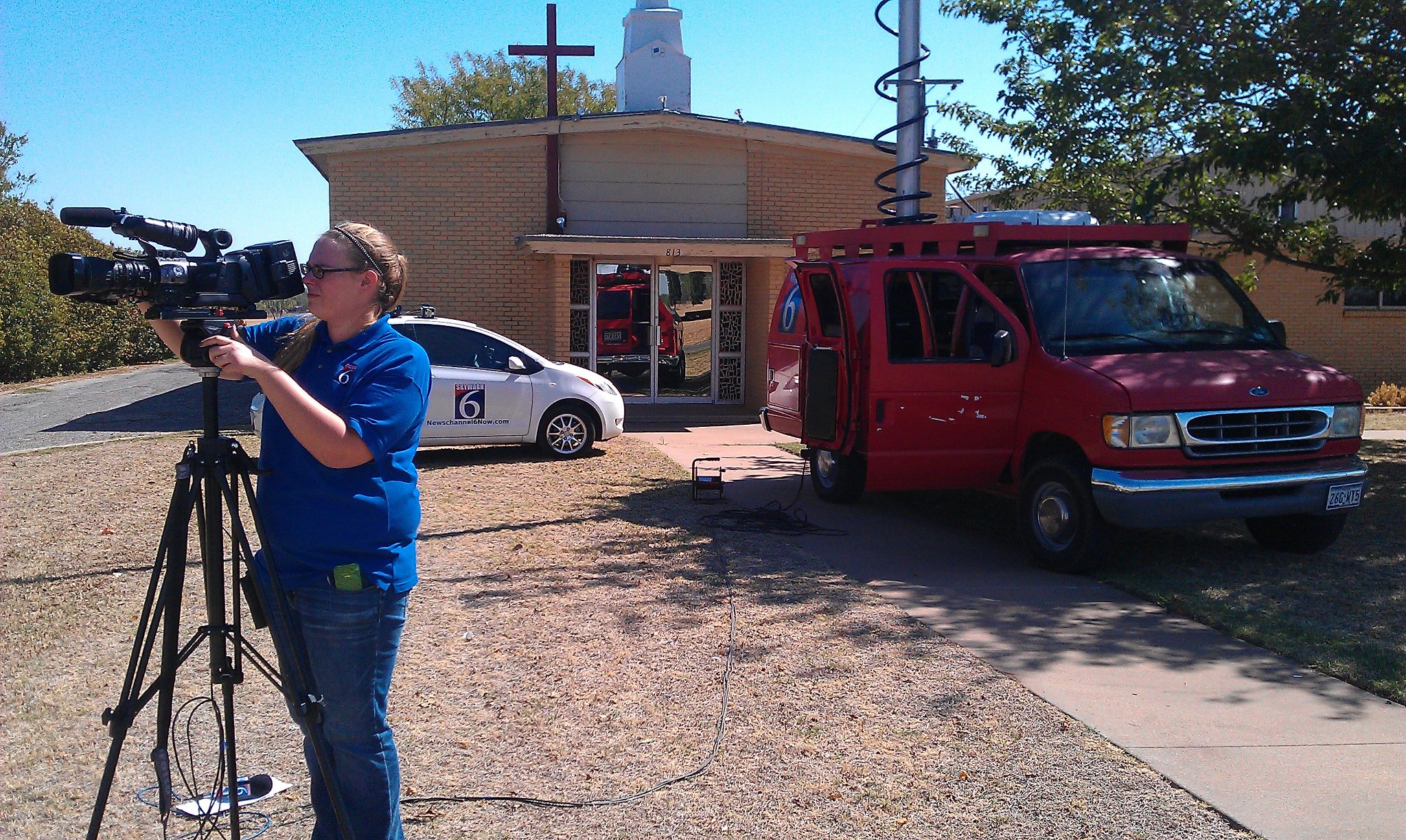 ![In this 2011 photo, photojournalist Colleen Welcher prepares the camera for the author to go live from a breaking news scene in Wichita Falls, Texas. Notice the van parked on the lawn of a church to keep the mast away from power lines which are just out of frame. [Sierra Harrop, W5DX, photo]](/img/130x97/exact/News/Live Truck.jpg)