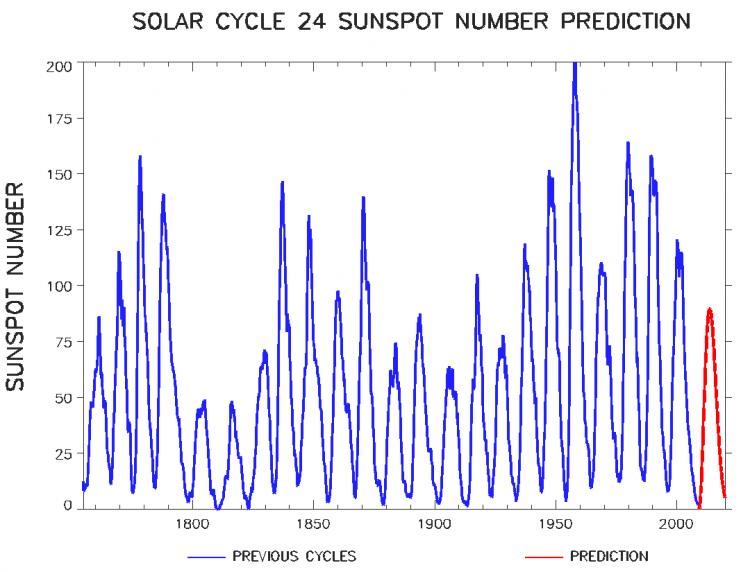 At the annual Space Weather Workshop held in Boulder, Colorado last month, an international panel of experts led by NOAA's Space Weather Prediction Center (SWPC) predicted that Solar Cycle 24 will peak in May 2013 with 90 sunspots per day on average. If the prediction proves true, Solar Cycle 24 will be the weakest cycle since Solar Cycle 16 which peaked with 78 daily sunspots in 1928, and ninth weakest since the 1750s, when numbered cycles began.