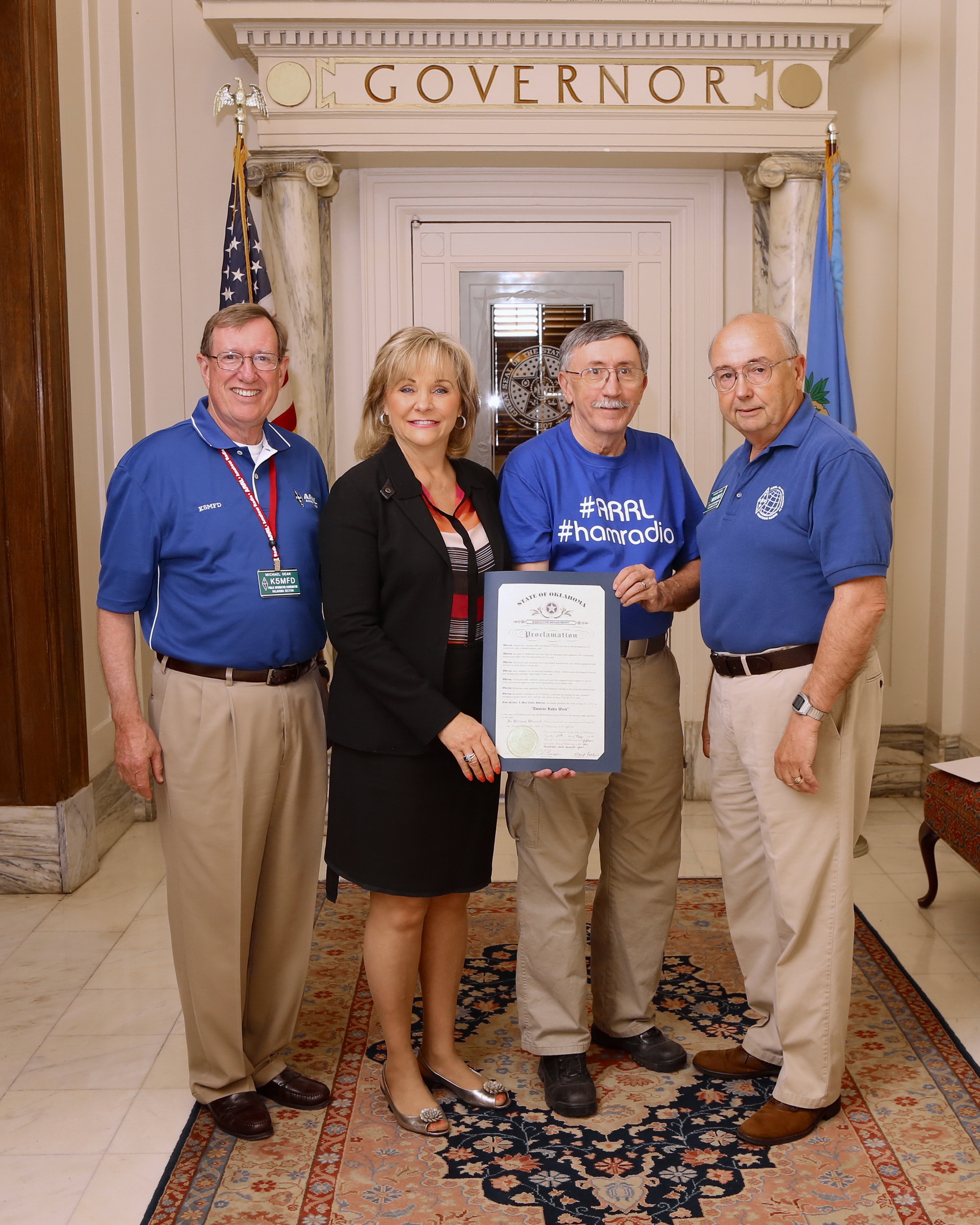 Oklahoma Gov Mary Fallin has proclaimed the week of June 21 as Amateur Radio Week and urged all Oklahomans “to pay tribute to the Amateur Radio operators of our state.” Fallin’s proclamation cites ham radio’s “significant role in the development of worldwide radio communication as well as its public service contribution. It notes that Field day “promotes the honing of radio amateurs’ emergency preparedness skills.” Speaking with ARRL Oklahoma Section Manager Lloyd Colston, KC5FM, Gov Fallin cited recent severe weather that Oklahoma has experienced in recent months, including tornadoes and flooding.
