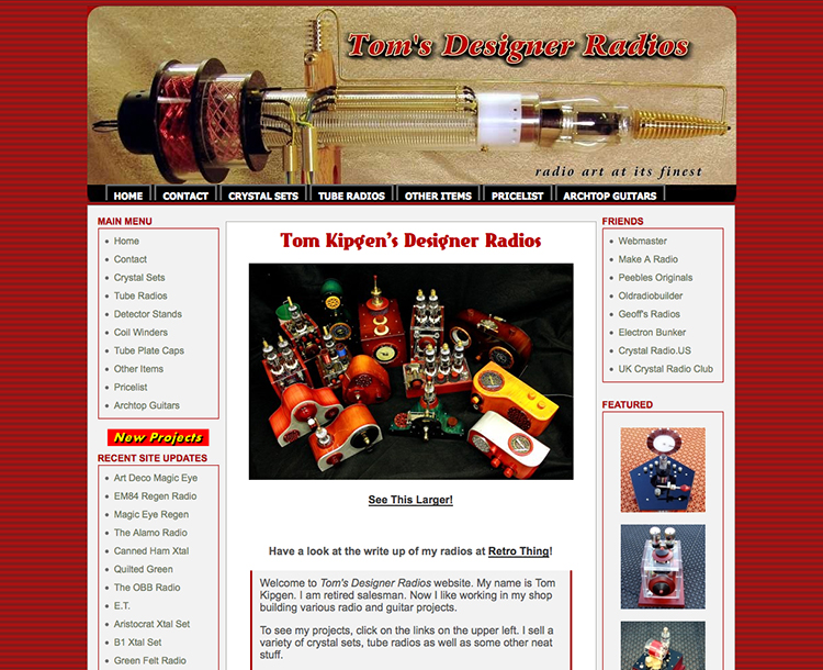 A picture is worth a thousand words, so I direct your attention to Tom’s Designer Radios website where you can view photos of Tom’s designs (representing tens of thousands of words), as well as words that describe the designs, which include crystal sets, tube radios and accessories like a horn speaker, amplifiers and coil winders.
