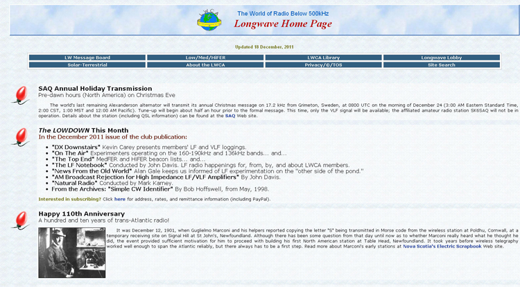 Meanwhile, the website of the Long Wave Club of America has more details about the various aspects of long wave radio, including long wave reception techniques and stations (experimental or otherwise) currently being heard on the long waves.