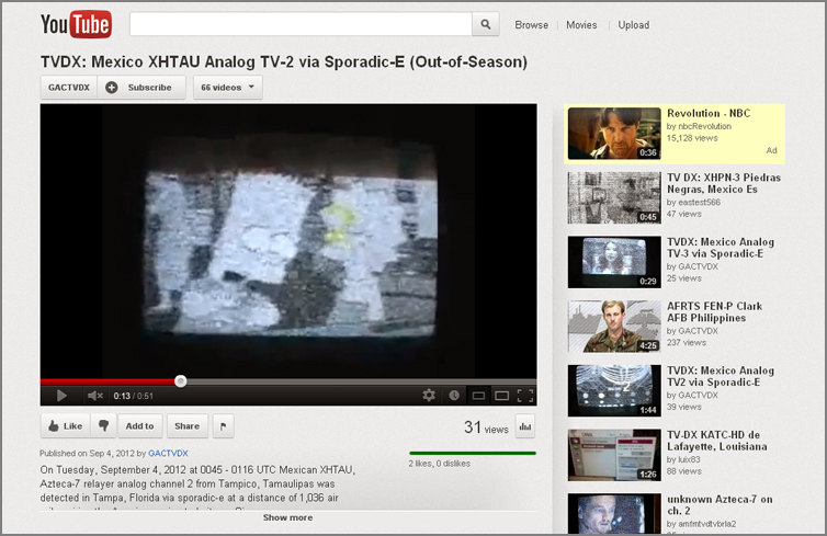 On Tuesday, September 4, 2012 at 0045-0116 (UTC), Mexican XHTAU, Azteca-7 relayer analog channel 2 from Tampico, Tamaulipas was detected in Tampa, Florida via Sporadic E propagation (also known as E-skip) at a distance of 1036 air miles broadcasting the American animated series The Simpsons.