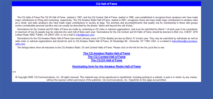 For those you feel are deserving yet missing, there is a nomination form here that you can submit by mail to CQ Amateur Radio Hall of Fame, 25 Newbridge Rd, Hicksville, NY 11801 or via e-mail.