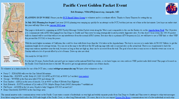 July 24 is “Golden Packet Sunday.” Bob Bruninga, WB4APR, hopes to field enough Amateur Radio communications teams located on mountains in the Eastern and Western USA to communicate packets and APRS messages from one end to the other of the 2175 mile Appalachian Trail on the East Coast, and the 2663 mile Pacific Crest Trail on the West Coast.