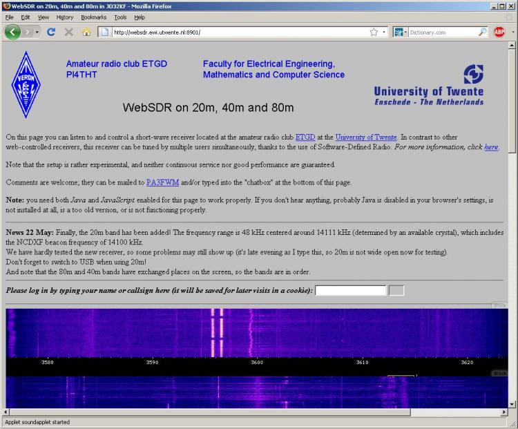 In tandem, Dennis Silage, K3DS, and Jacques Culot, ON5MJ, contacted me about WebSDR on 20, 40 and 80 meters, "a site that is really innovative." Located at University of Twente in Enschede, The Netherlands, this is Web site allows you to remotely listen to and control a shortwave receiver located at the University's Amateur Radio club ETGD (Experimentele Telecommunicatie Groep Drienerlo) PI4THT. In contrast to other Web-controlled receivers, this receiver can be tuned by multiple users simultaneously, thanks to the use of Software-Defined Radio (SDR).