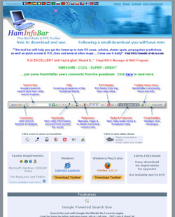 Haminfobar is a tool bar for Amateur Radio that "has everything you can possibly imagine for the hobby and best of all, it's free," according to Stuart Hills, who e-mailed me about this Web browser add-on. It allows you access current DX news, propagation predictions, maps, charts, ham radio search engines and podcasts and lots more. It is available for the Windows version of Internet Explorer and the Windows, Mac and Linux versions of Firefox.