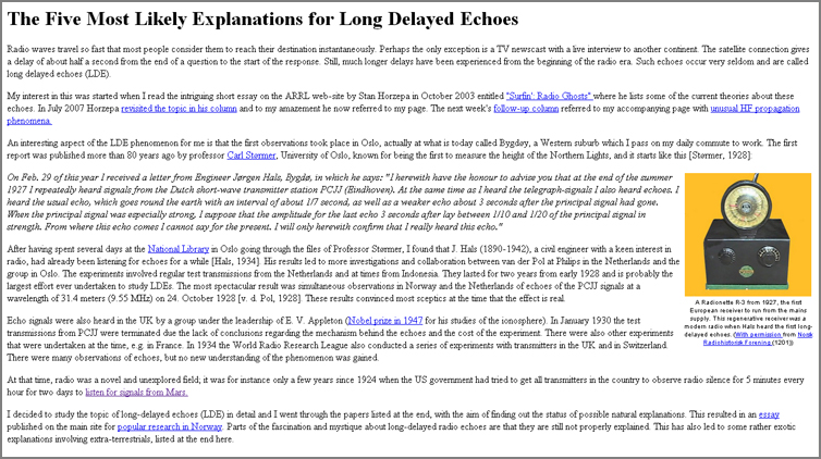 Writing about LDEs in the past, I referred you to Sverre Holm, LA3ZA, at the University of Oslo, who is also fascinated by those radio echoes. The original “Radio Ghosts” episode of Surfin’ that appeared here nine years ago sparked Sverre’s interest in LDEs. Since that time, he researched the subject and came up with “The Five Most Likely Explanations for Long Delayed Echoes” and “15 Possible Explanations for Long Delayed Echoes”.