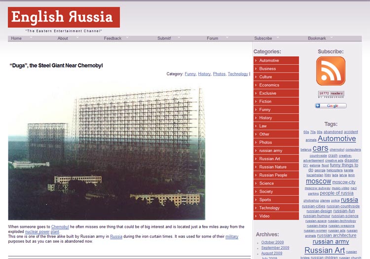 It is an interesting piece of radio history, but what rekindled my interest in the Russian Woodpecker is the spate of photographs of the Duga-3 antenna farm that I have encountered on the Internet recently. Your mileage may vary, but I believe one of the best collections of photographs is on the English Russia Web site.