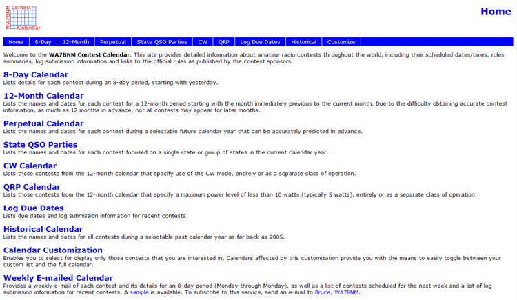 In the meantime, I visited the Contest Calendar Web site of Bruce Horn, WA7BNM. The site bills itself as providing “detailed information about Amateur Radio contests throughout the world, including their scheduled dates/times, rules summaries, log submission information and links to the official rules as published by the contest sponsors.”