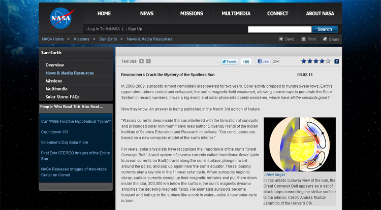 The March 3 edition of Nature expands on the conclusions, while the NASA website proffers Dr Tony Phillips’ article “Researchers Crack the Mystery of the Spotless Sun” on the matter.