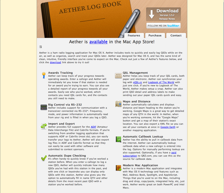 Ether is one thing, but Aether is something else. It’s a ham radio logging application from Open Reel software for the Mac OS X that I just discovered on the Internet. Being a longtime Mac ham, I am always on the alert for new Mac ham apps, and when I discover them, I pass the discovery along to you readers.