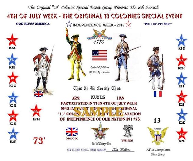 Stations will be on the air from each of the original 13 colonies — Connecticut (K2D), Delaware (K2E), Georgia (K2G), Massachusetts (K2H), Maryland (K2F), North Carolina (K2J), New Hampshire (K2K), New Jersey (K2I), New York (K2A), Pennsylvania (K2M), Rhode Island (K2C), South Carolina (K2L), and Virginia (K2B). All HF bands and all modes will be in play, with the exception of 60 meters. Operation on 2 and 6 meter simplex is encouraged.