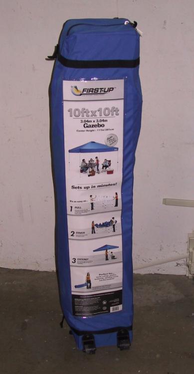 My wife Nancy had given me a fold-up canopy for Christmas, but I had yet to take it out of its box; in fact, it still had a large Christmas bow wrapped around it. I figured I'd better make sure I knew how to set it up before I dragged it to the block party and amused my neighbors by playing "Goofy Sets Up a Tent." Fortunately, the manufacturers of the First Up canopy had both Goofy -- and me -- in mind when they designed the canopy. It went up just fine. And just in case I got careless and lost the instructions, they had stitched spare instructions with pictures right on the carrying case.