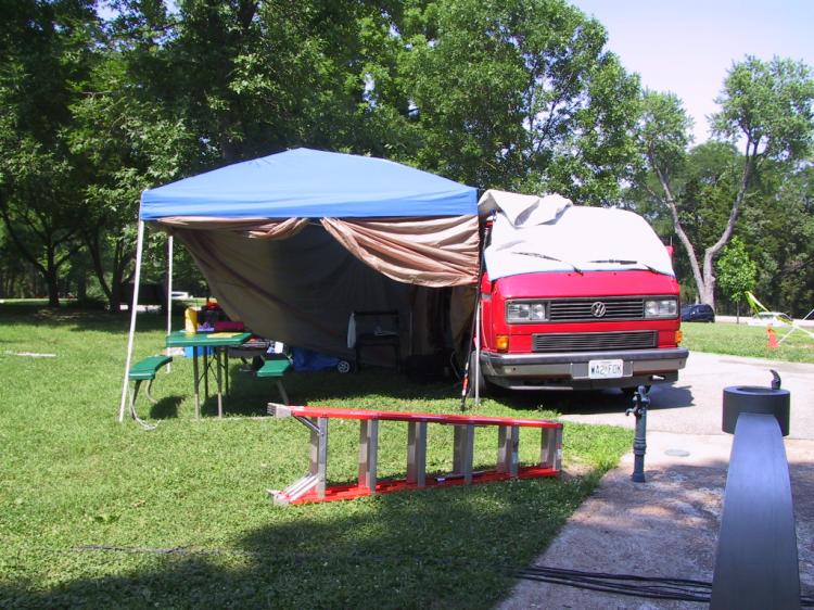 It was hot in St Louis that day. It usually is on Field Day, but it was exceptionally hot this year. Officially, it never broke 99 degrees, but with the heat index figured into the equation it was close to a million. When I arrived at the SLSRC Field Day site, I saw that Mark Biernacki, KB5YZY, had set up a cooling station. It consisted of a van with a big air conditioner hanging out of one window. The other windows had been covered with thermal blankets. A canopy was attached to the entrance to the van to form a shady porch (or perhaps an airlock).
