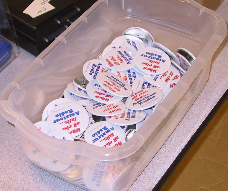 Okay, smiling isn’t helping. No one is stopping at our table. Wait. Someone is stopping. He’s interested in something on our table. Oh. The freebie handout. And our free button, of course. By the end of the hamfest everyone will be wearing one of those.